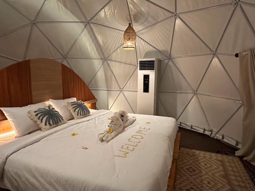 Spacious glamping dome tent with private outdoor bathroom